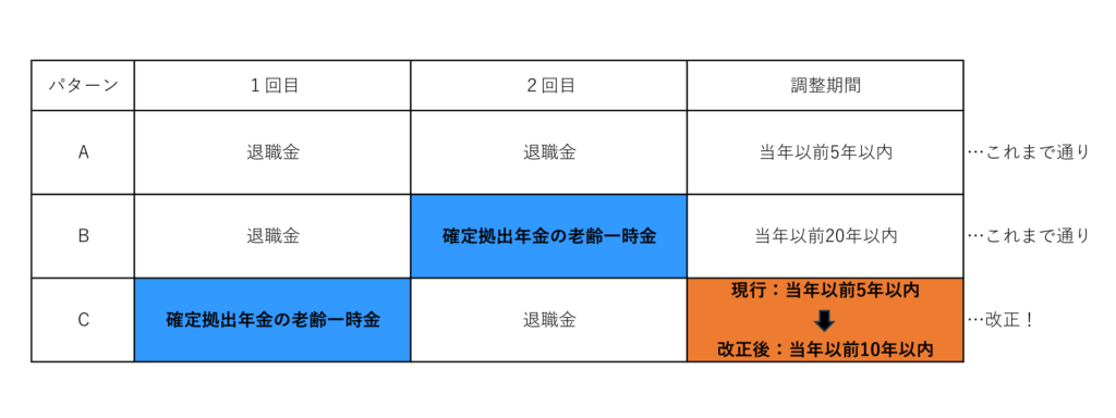 今回の令和7年度改正では、令和8年1月1日以降に確定拠出年金の老齢一時金を受け取った同日以後に、2回目の退職金を受け取った場合の調整期間に改正が入りました。(下記図表パターンC)